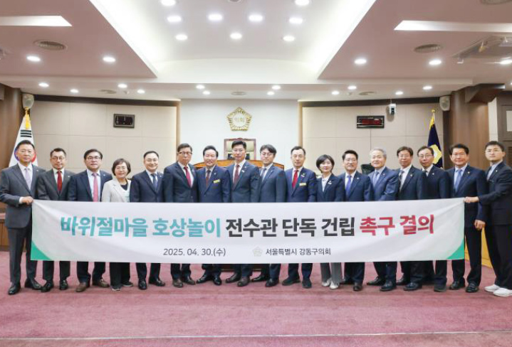강동구의회는 결의안을 통해 ▲바위절마을 호상놀이 전수관이 강동구에 단독으로 건립될 수 있도록 모든 행정적 노력을 기울일 것 ▲전수관 건립을 통해 호상놀이의 원형을 보존하고 시민 교육의 장으로 활용될 수 있도록 적극 나설 것 ▲바위절 마을 호상놀이의 보호와 지속 가능한 전승을 위해 정책적·재정적 지원을 강화할 것을 강력히 촉구했다.