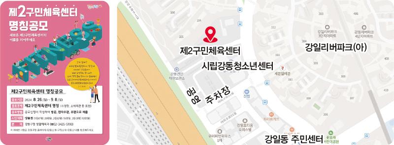 강동구는 온조대왕문화체육관 다음으로 생기는 제2구민체육센터의 이름을 공모한다.(강일동 665-5 및 665-12 일원, 11월 준공 예정) 수영장, 배드민턴장 등을 갖추고 12월과 내년 초 임시 운영을 거쳐 2025년 5월 정식 개관할 예정이다.