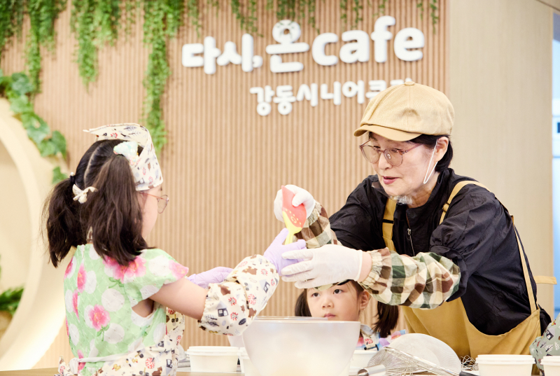 강동숨;터 3층에 위치한 ‘다시,온 카페·공방’은 요즘 활기가 가득하다. 이곳에서 매주 아이부터 어른까지 다양한 연령층이 참여하는 일일강좌가 열리기 때문이다. 무엇보다 특별한 건 강사들이 모두 노인일자리 참여 어르신이라는 점이다. 제과제빵, 바리스타, 목공예, 가죽공예 등의 프로그램을 통해 어르신들은 자신이 걸어온 길을 다시 꺼내어, 주민들과 따뜻한 만남을 이어가고 있다.